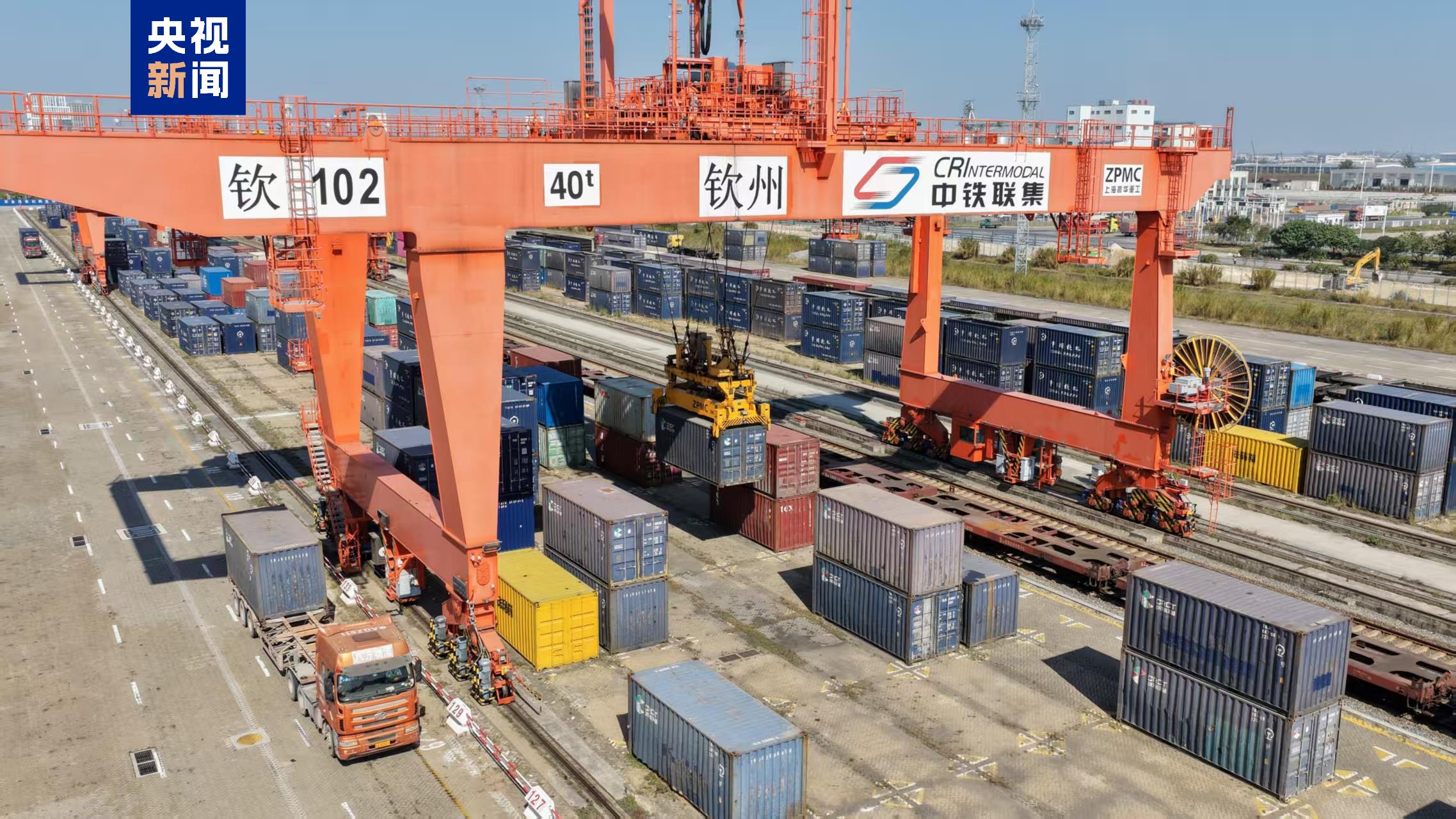 位于西部陆海新通道铁海联运枢纽的广西沿海铁路公司钦州港东站副站长赵坚介绍,今年来自泰国、莫桑比克、印尼等国家的纸浆、锂辉石、橡胶等进口货物增幅较大,重庆的发电机组、广西的汽车零配件等出口货物增幅明显。为满足运输需求,车站优化运输组织,今年累计6次刷新单日装卸车作业次数纪录,最高达1405车/日。
